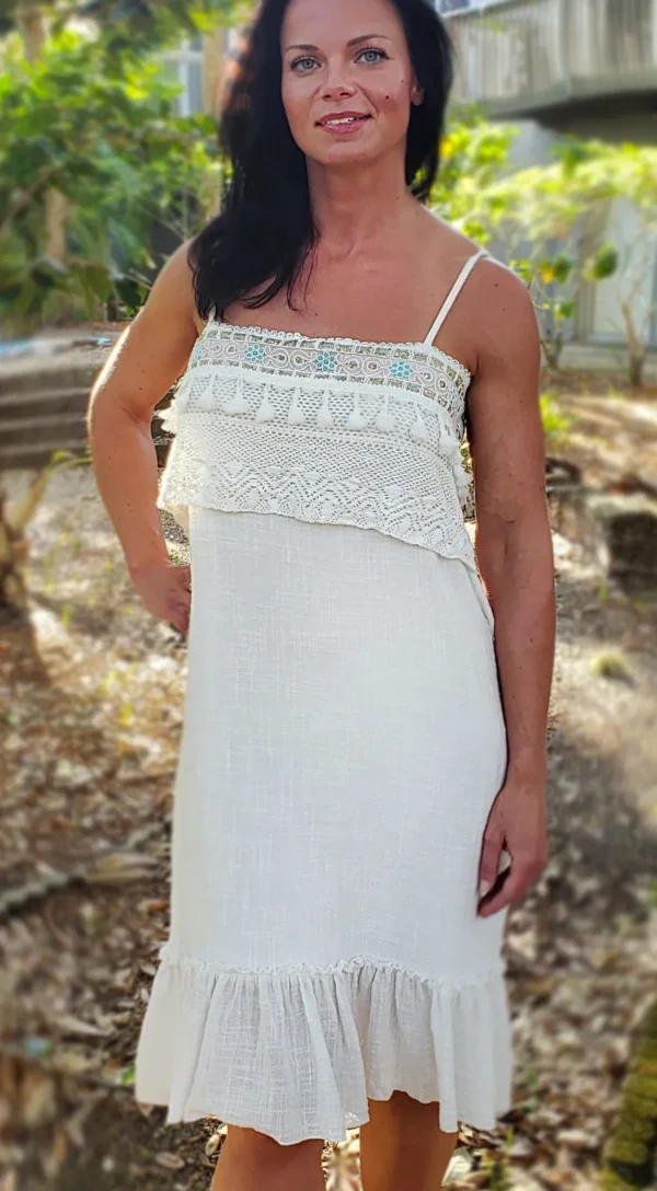 Crochet bust, sequins, adjustable shoulder straps, ruffle bottom hem, natural cotton.