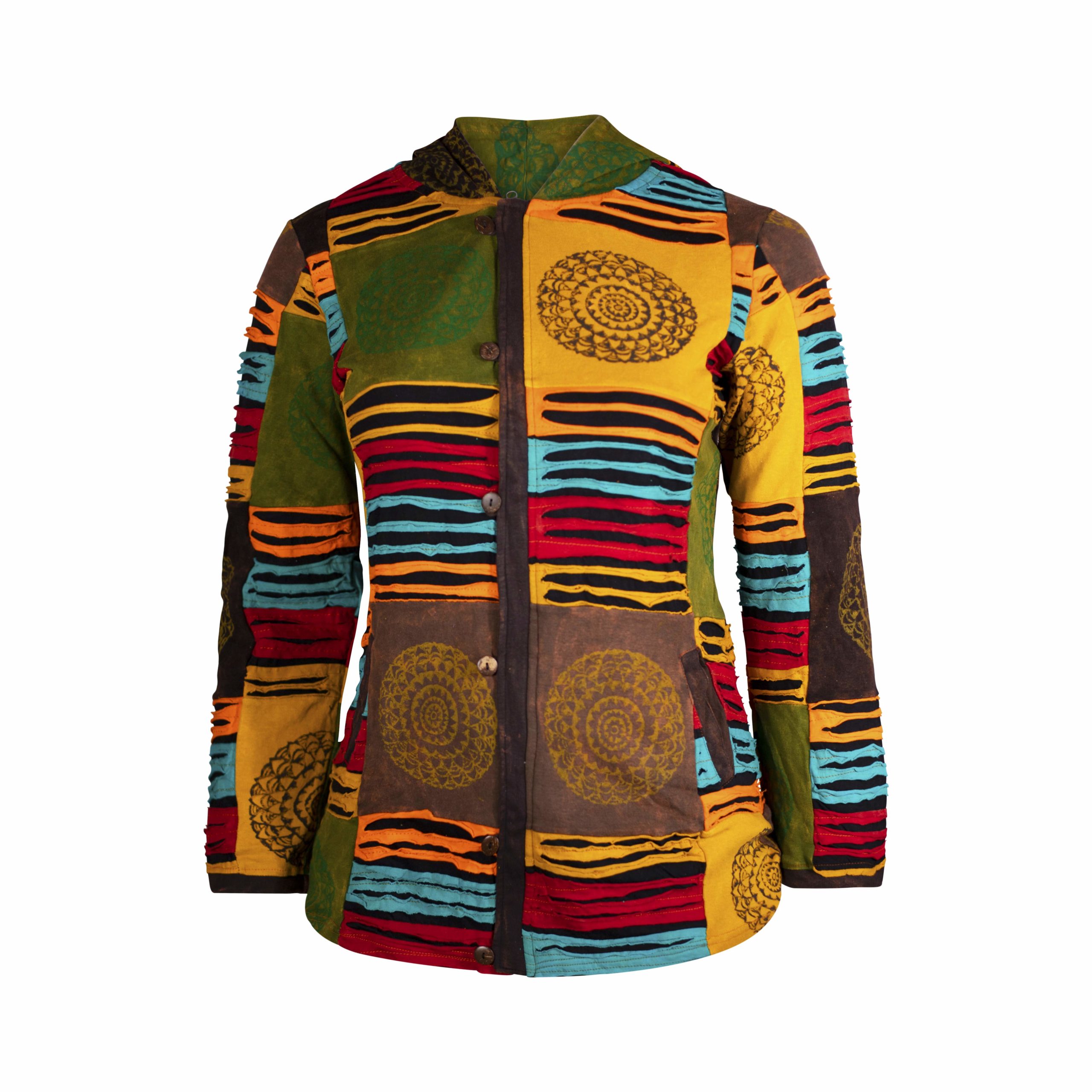 Patched work of vibrant colors and mandala prints, great for all seasons.